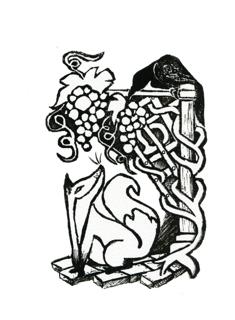 the raven, the fox, and some grapes – 5×7 block print 2017