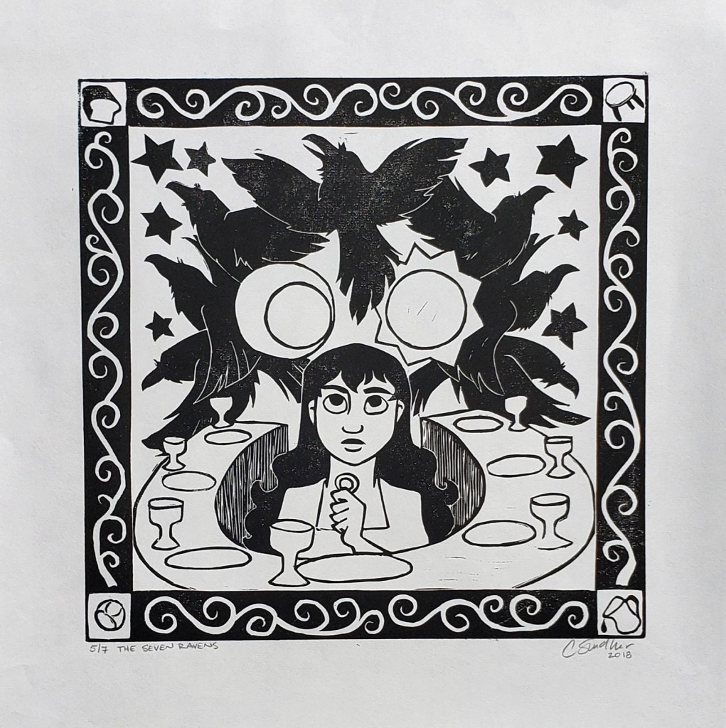 the seven ravens- 12×12 lino print on hosho paper edition of 7 2019